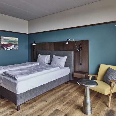 Une nuit dans une chambre confortable, aménagée avec beaucoup de bois, et un petit-déjeuner complet en font partie. Le concept global de la halle automobile comprend 20 chambres doubles modernes et climatisées. Les passionnés de voitures ne sont pas les seuls à trouver ici une possibilité de passer la nuit, les voyageurs d'affaires ou les familles sont également les bienvenus.