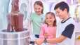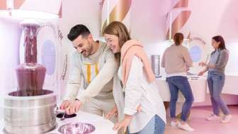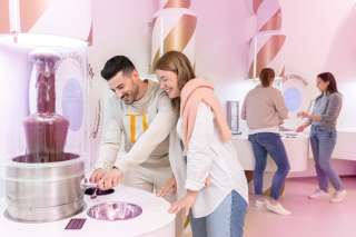 Dans le nouvel espace dédié au bonheur individuel, plusieurs fontaines de chocolat liquide rayonnent et invitent à goûter et à évaluer les saveurs blanc, lait, noir, framboise (la première fontaine rose !) et même le gianduja végétalien. Le grignotage est ici expressément souhaité.