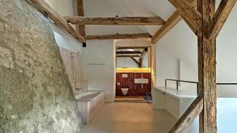 Im ersten Obergeschoss liegt das Schlafzimmer mit Doppelbett und einer kleinen Leseecke. Durch das Fenster fällt der Blick Richtung Rhein. Ein besonderes Detail ist die grosszügige, zum Raum offene Badewanne. Natürlich werden Handtücher, Shampoo und Duschgel zur Verfügung gestellt. Hier ist auch ein Arbeitsplatz eingerichtet, damit du deine Gedanken ins Notizbuch schreiben, etwas malen oder Postkarten versenden kannst.