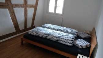 Petit appartement de vacances de 2 pièces à Siblingen. Sur demande, nous proposons également le petit-déjeuner. Le joli appartement a tout ce qu'il faut, cuisine (avec four, machine à café, bouilloire), salle de bain, chambre à coucher pour 2 personnes, salon-salle à manger avec un canapé-lit pour 2 personnes. Il y a aussi un petit jardin clôturé avec une table et des chaises.