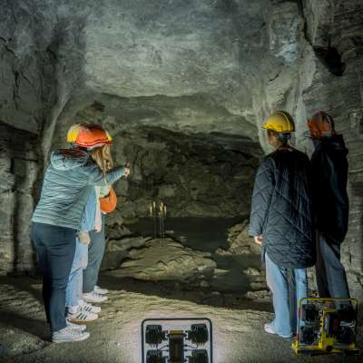 Aujourd'hui, les visiteurs peuvent s'enfoncer dans les entrailles de la montagne sur les traces des anciens concasseurs de gypse, à une profondeur d'environ 200 mètres, jusqu'à ce qu'un petit lac les arrête - comme les mineurs d'autrefois.