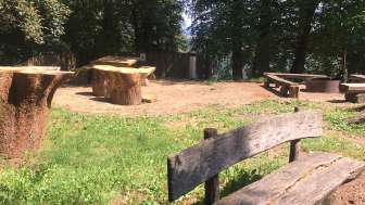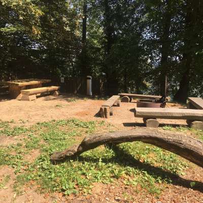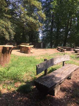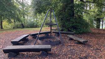 Agréable foyer dans la forêt avec des bancs et une grille. A côté se trouve une aire de jeux. La cabane simple peut être louée (sans aménagement intérieur).