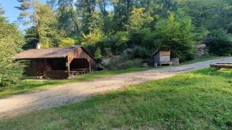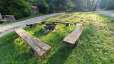 Un vaste espace barbecue avec de nombreuses places assises. Certaines places assises se trouvent dans une petite cabane ouverte et offrent un abri en cas de mauvais temps.