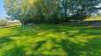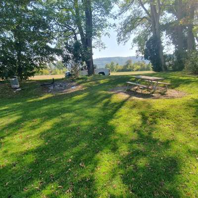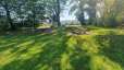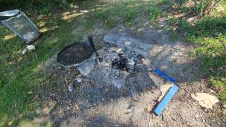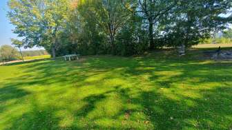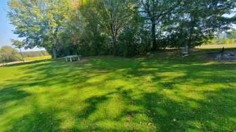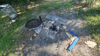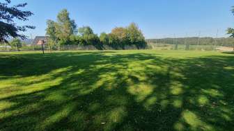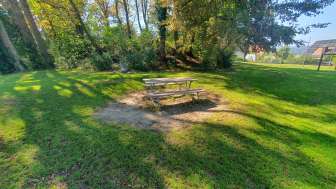 Il y a un foyer et une table avec des bancs. Juste à côté se trouve une prairie avec un terrain de football.