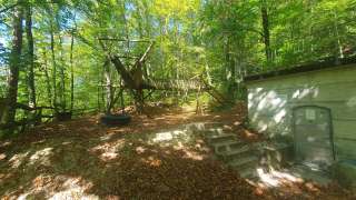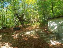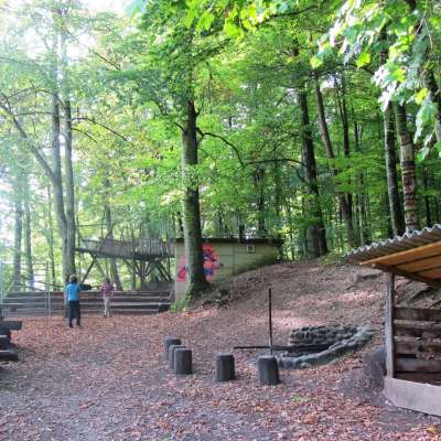 A la lisière de la forêt, deux tables avec bancs, terrain de jeux d'aventure