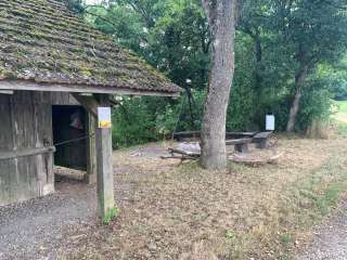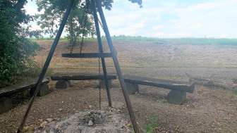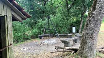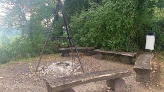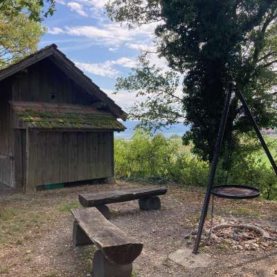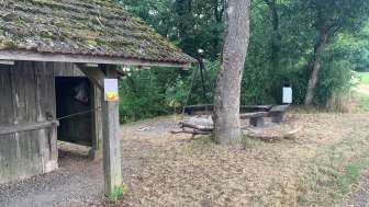 La place de grillade Rummele à Oberhallau dispose d'un foyer ouvert avec cinq bancs en bois tout autour. A côté se trouve une petite cabane en bois avec un abri.