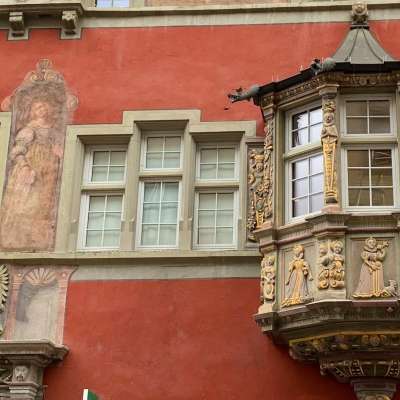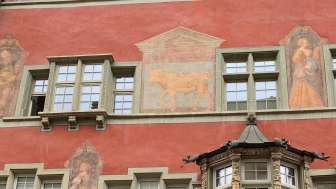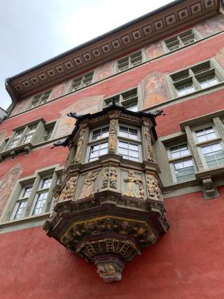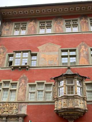 17ème siècle. Une des plus grandes maisons de l'ancien Schaffhouse, située sur l'ancien Rindermarkt. Elle a notamment servi d'auberge jusqu'en 1608. Lors de sa transformation en 1608 en une maison bourgeoise distinguée, la façade de style gothique tardif a reçu le faste de la Renaissance allemande sous forme d'oriel et de portail. Les fresques de la façade représentent un bœuf doré comme symbole de la maison et des personnages de l'histoire babylonienne et de l'Antiquité grecque. Il s'agit notamment des héros de la guerre de Troie.