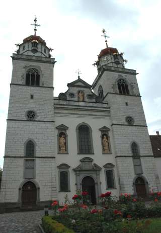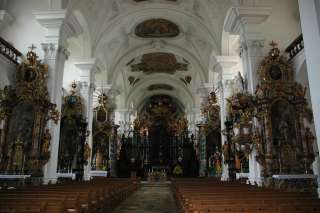 L'église du couvent de Rheinau a été conçue d'après un modèle de cathédrale du Vorarlberg : Sept travées, salle à piliers muraux ; le transept et le sanctuaire sont légèrement surélevés et séparés de la nef laïque par une grille.