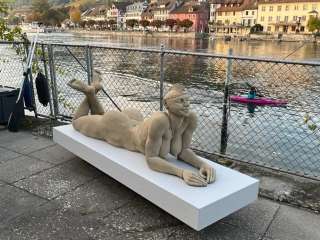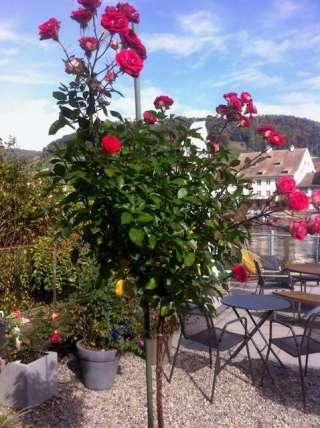 Beau jardin directement au bord du Rhin avec différentes sculptures, par ex. de Peter Lenk, Carstten Kretschmar, Willi Hofmann, etc. ainsi que plus de 65 pots de roses, rosiers, fleurs, arbustes, etc.