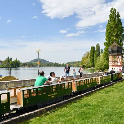 Offrez-vous un trajet d'à peine 10 minutes et savourez l'expérience d'être tracté le long du Rhin par un modèle réduit de locomotive électrique d'autrefois ou par un grand modèle réduit de locomotive à vapeur qui souffle et souffle.