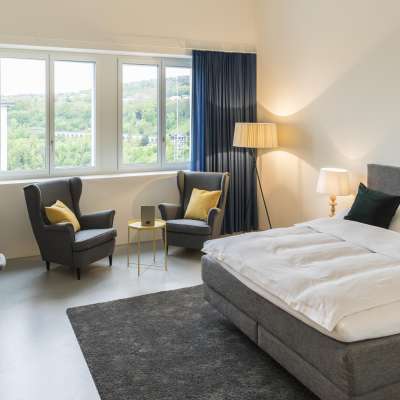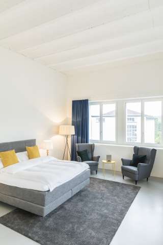 L'accès au mini-hôtel se fait par self-check-in avec un code PIN d'accès qui vous est automatiquement envoyé après la réservation. Réservez la chambre d'hôtes en toute simplicité via l'application SIG Areal et réjouissez-vous de passer une nuit reposante sur le site SIG Areal am Rheinfall.
