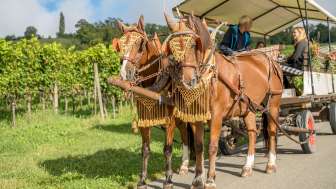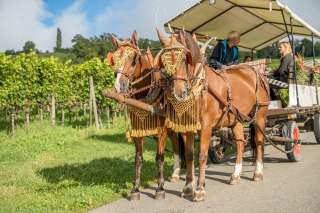 Loin de l'agitation, tu profites d'une agréable balade en calèche à travers les vignes. Fais-toi promener en calèche dans la région et choisis librement le lieu d'arrivée et de départ selon tes envies. Sur demande, les cochers peuvent offrir du vin et de l'eau minérale sur la voiture.