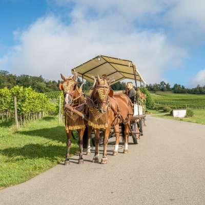 Profite d'une balade en calèche nostalgique balade en calèche à travers le vignoble de Hallau avec une vue pittoresque sur le "Chläggi".