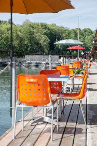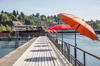 Abschalten vom Alltag und der Seele Gutes tun. Sonnenschein, kühles Nass, spritzige Getränke und Gaumenfreuden. Energie tanken und gemütliche Abendstunden in ausgelassener Stimmung geniessen. Saisonale, regionale Mittagsmenüs, täglich frisch. Geschichte Seit 1870 stellt das grosse Schaffhauser Holzbad seinen Bug in die Rheinströmung unter dem Munot. Verantwortlich für den Bau des grössten noch erhaltenen Kastenbades der Schweiz (es soll gar die älteste Flussbadeanstalt Europas sein) war Stadtbaumeister Johann Gottfried Meyer. Durch die Stauung des Kraftwerkes ist der Pegelstand im Bad konstant. Schwimmer sollten jedoch beachten, dass die Strömung des Rheins bei grösserer Wassermenge schneller wird.