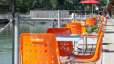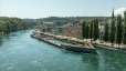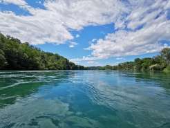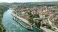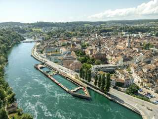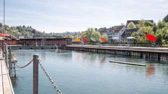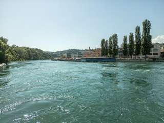 Piscine fluviale historique avec des plongeoirs d'environ 1 et 3 m de haut et différents bassins dans l'eau du Rhin.