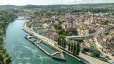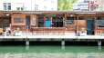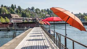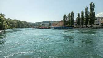 Historisches Flussbad mit Sprungbretter ca. 1 und 3 m hoch und verschiedenen Becken im Rheinwasser.