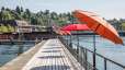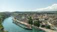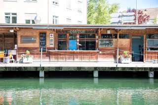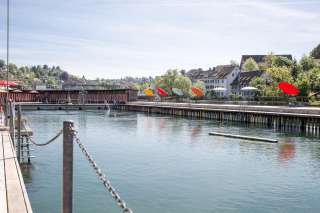 Bain fluvial historique avec des plongeoirs d'environ 1 et 3 mètres de haut et différents bassins dans l'eau du Rhin.