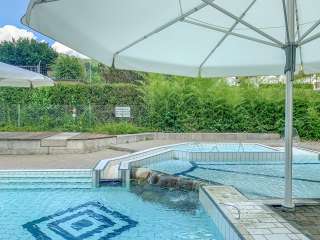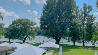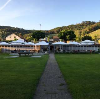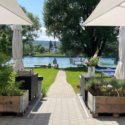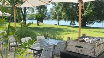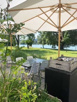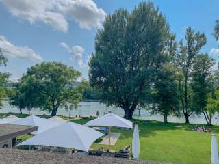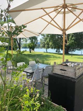Plage avec une grande prairie de baignade directement au bord du Rhin et de vieux arbres, avec une aire de jeux pour enfants, une pataugeoire avec voile solaire, un plongeoir (accessible uniquement lorsque la baignade est surveillée - les week-ends et pendant les vacances d'été), un terrain de volley-ball ainsi que le café "Uferlos" avec de nombreux délices et une ambiance spéciale.