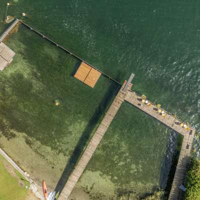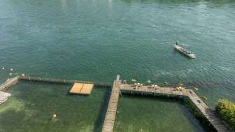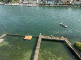 Une piscine pour les familles, les enfants et tous ceux qui aiment l'eau. La bordure en bois avec passerelle offre une protection contre le courant et les profondeurs du Rhin. À l'intérieur, la surveillance aquatique est assurée. La baignade dans le Rhin à ciel ouvert se fait à vos propres risques.