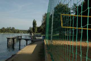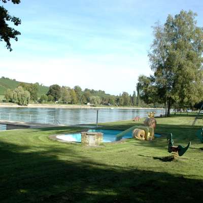 Piscine fluviale au bord du Rhin, bassin non-nageur, pataugeoire pour enfants, plongeoir de 3 m, terrain de beach-volley, tennis de table, barbecue, "Octopus" dans le Rhin