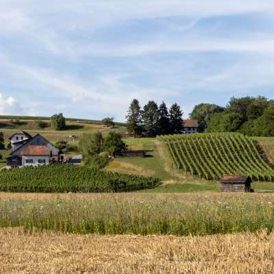 Notre exploitation familiale de 11,3 ha se trouve à l'extrémité sud du canton de Schaffhouse. Les 0,7 ha de vignes sont cultivés et entretenus toute l'année par la troisième génération de viticulteurs, avec amour et à la main. C'est avec le même soin que nous vinifions nous-mêmes nos vins dans notre propre cave.