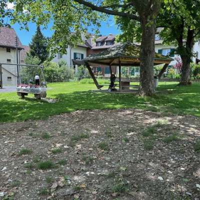 Sur la petite place de jeux se trouve une tour à grimper avec un toboggan et une balançoire. Le pavillon couvert permet de prendre un goûter par tous les temps.