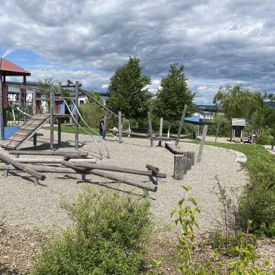 Aire de jeux avec de nombreux éléments de jeux passionnants pour tous les âges : toboggan, zone de sable, tour à grimper, bascule et zone de blanc.