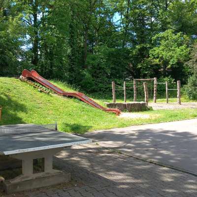 Spielplatz mit vielen spannenden Spielelementen für jedes Alter: Schaukeln, Rutsche, Sandfläche, Reckstangen, Balancierbereich, Kletternetz und vieles mehr.