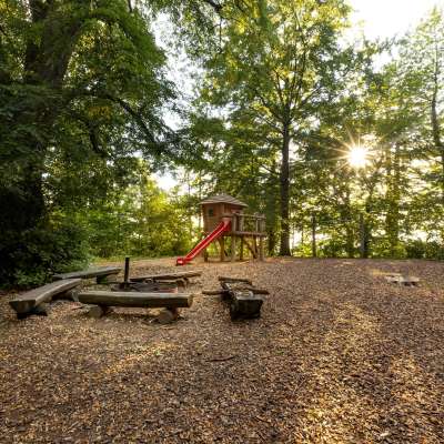 L'aire de jeux est équipée d'une tour d'escalade en bois avec un toboggan et une balançoire. Juste à côté se trouve un barbecue.
