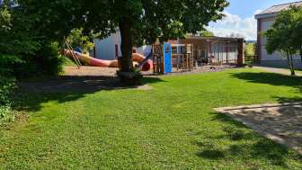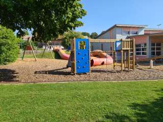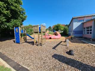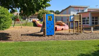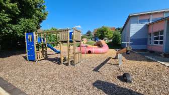 Un toboggan, un tunnel, une structure d'escalade, une bascule et une balançoire font briller les yeux des enfants.