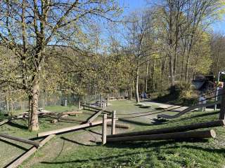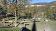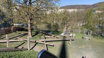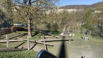 Ein kleiner Spielplatz mit Rutschbahn, Kletterseilen und Balancierbalken beim Schloss Laufen lädt zum Austoben ein.