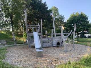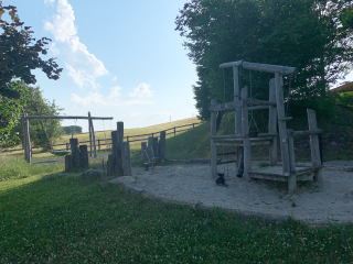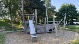 Une structure d'escalade, une fontaine avec un cours d'eau, un toboggan, une bascule, une tyrolienne et une balançoire font battre le cœur de tous les enfants.