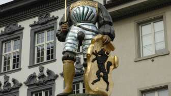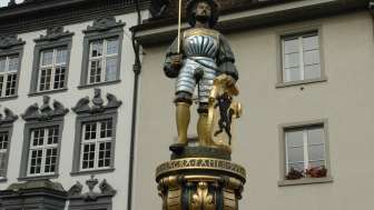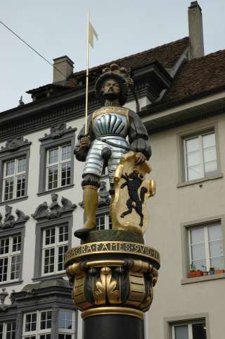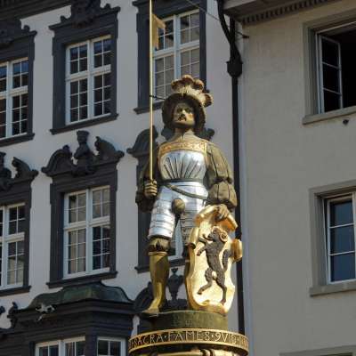 La fontaine de la place Walther-Bringolf a plus de 400 ans. Elle a probablement été construite en 1596 et réaménagée au 18e siècle. La colonne avec la figure du lansquenet est une copie de la statue de la fontaine du Fischmarkt, qui a été démolie en 1840, et orne la fontaine de la place Walther-Bringolf depuis 1925.