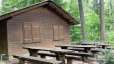 A côté de la cabane, il y a un barbecue et diverses tables et bancs.